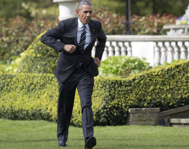 奥巴马一路小跑与英国消防员握手 表情到位